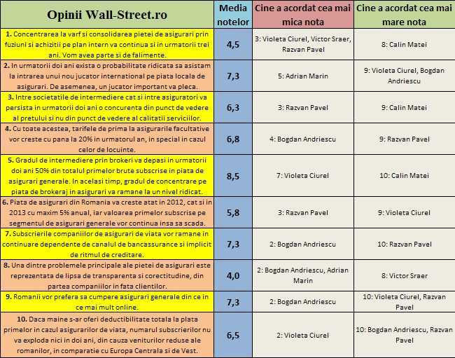 In tabelul urmator puteti vizualiza enunturile propuse de Wall-Street.ro, media notelor oferite de catre cei sase respondenti, precum si cine a dat cea mai mica, respectiv cea mai mare nota. Unele opinii sunt compuse si din doua propozitii, carora specialistii le-au acordat cateodata si note separate. Fiind vorba despre aceeasi tema, Wall-Street.ro a luat in considerare media celor doua note.