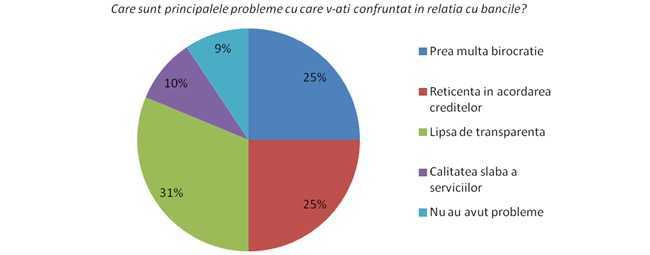 La intrebarea “Care sunt principalele probleme cu care v-ati confruntat, de-a lungul timpului, in relatia dumneavoastra cu bancile?”, peste o treime dintre persoanele intervievate au indicat lipsa de transparenta in ceea ce priveste comisioanele si taxele aferente creditelor.