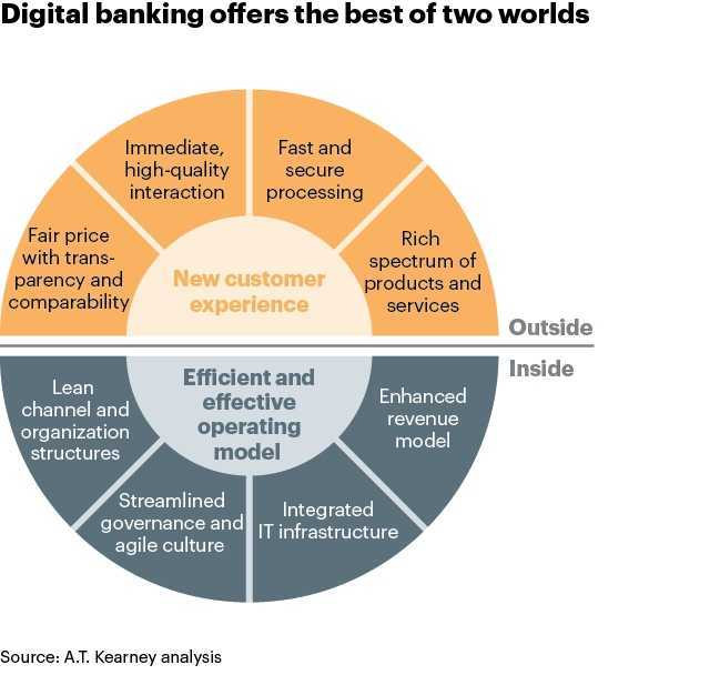 In mod ideal, digital banking-ul combina beneficiile a doua lumi: o noua experienta oferita clientului la suprafata si un model operational eficient la interior.
