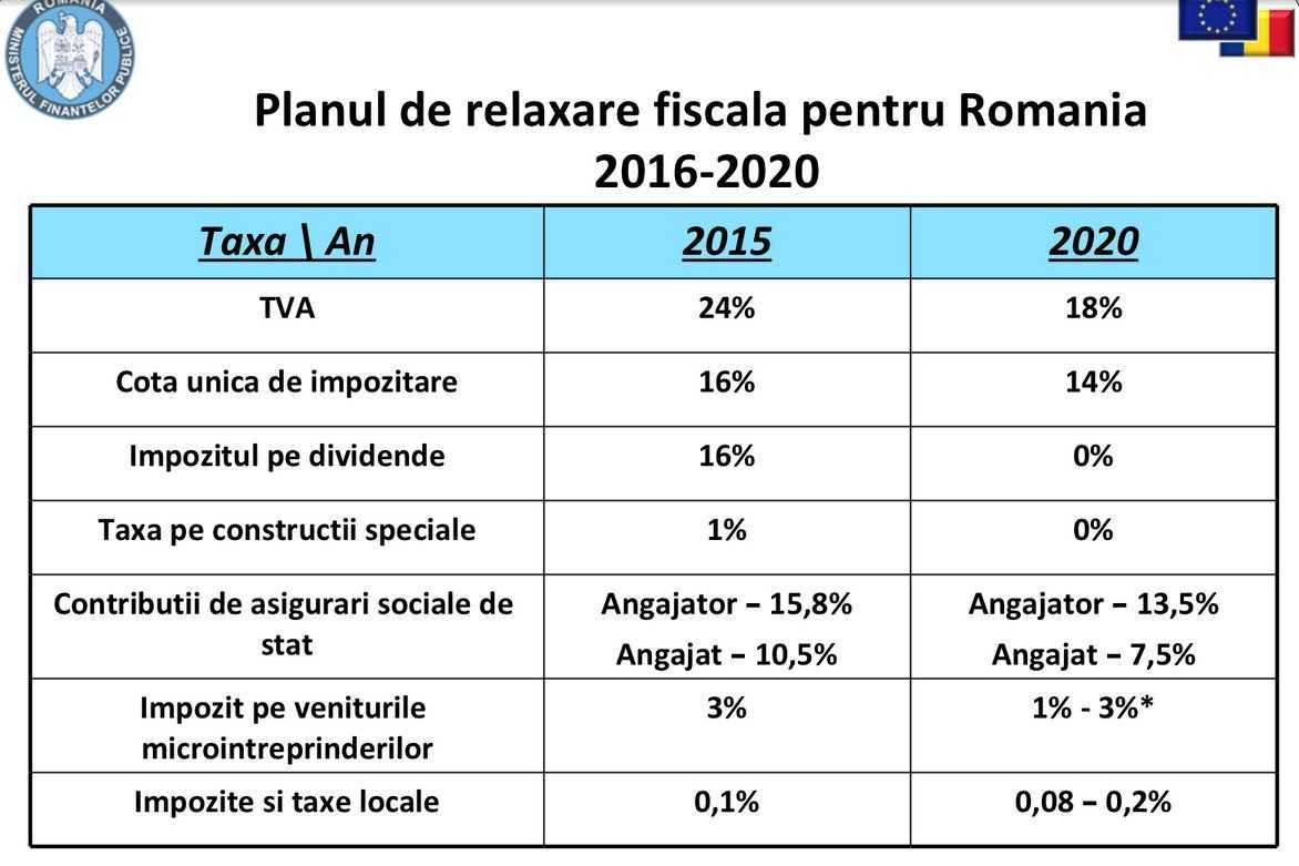 Experimentul fiscal optimist anuntat miercuri de Guvern se va concretiza, cel putin in teorie, intr-un mediu fiscal mai relaxat, prin taierea cu 25% a cotei standard a TVA, reducerea usoara a cotei unice si eliminarea impozitului pe dividende. Mai jos gasiti toate taxele si impozitele vizate de Guvern pentru perioada 2016-2020.