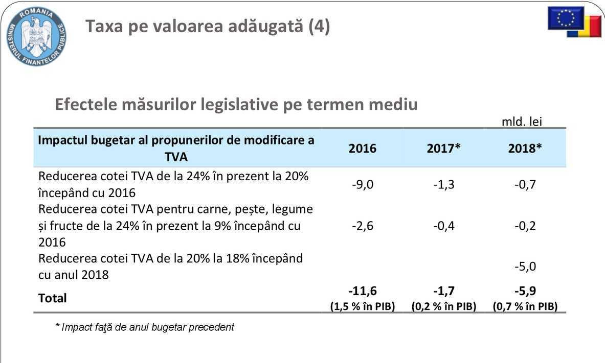 Profesorul de economie Dan Armeanu considera ca doar impactul reducerii TVA de la 24% la 20% nu este foarte mare si "poate fi usor acomodat de imbunatatirea colectarii si a reducerii evaziunii fiscale".Totodata, Armeanu spune ca aceste masuri conteaza foarte mult pentru investitorii straini, care vor aprecia predictivitatea si stabilitatea.