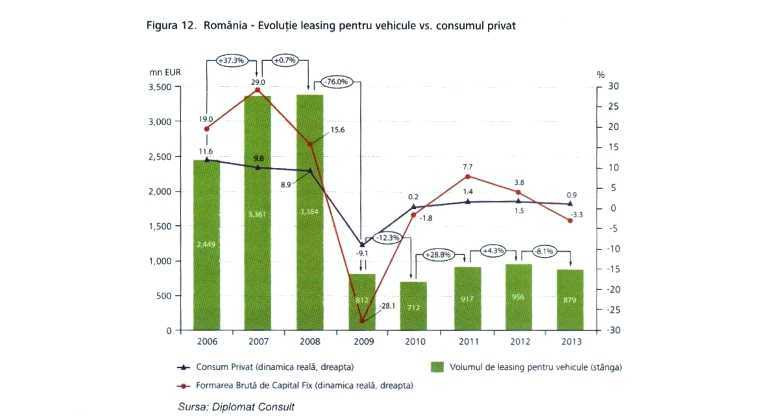 Momentul vulnerabil al pietei de leasing a fost anul 2009, atunci cand societatile de leasing au fost puternic afectate de criza financiara si noile contracte de leasing au scazut puternic la 1,3 miliarde de euro de la aproape 5 miliarde de euro in 2007. De atunci, valoarea anuala totala de contracte noi de leasing nu a inregistrat variatii considerabile, ceea ce a reflectat o oarecare stabilizare a pietei de leasing, desi conditiile economie au fost dificile, prin reducerea facilitatilor fiscale si contractia cererii de creditare a companiilor pentru echipamente si vehicule.