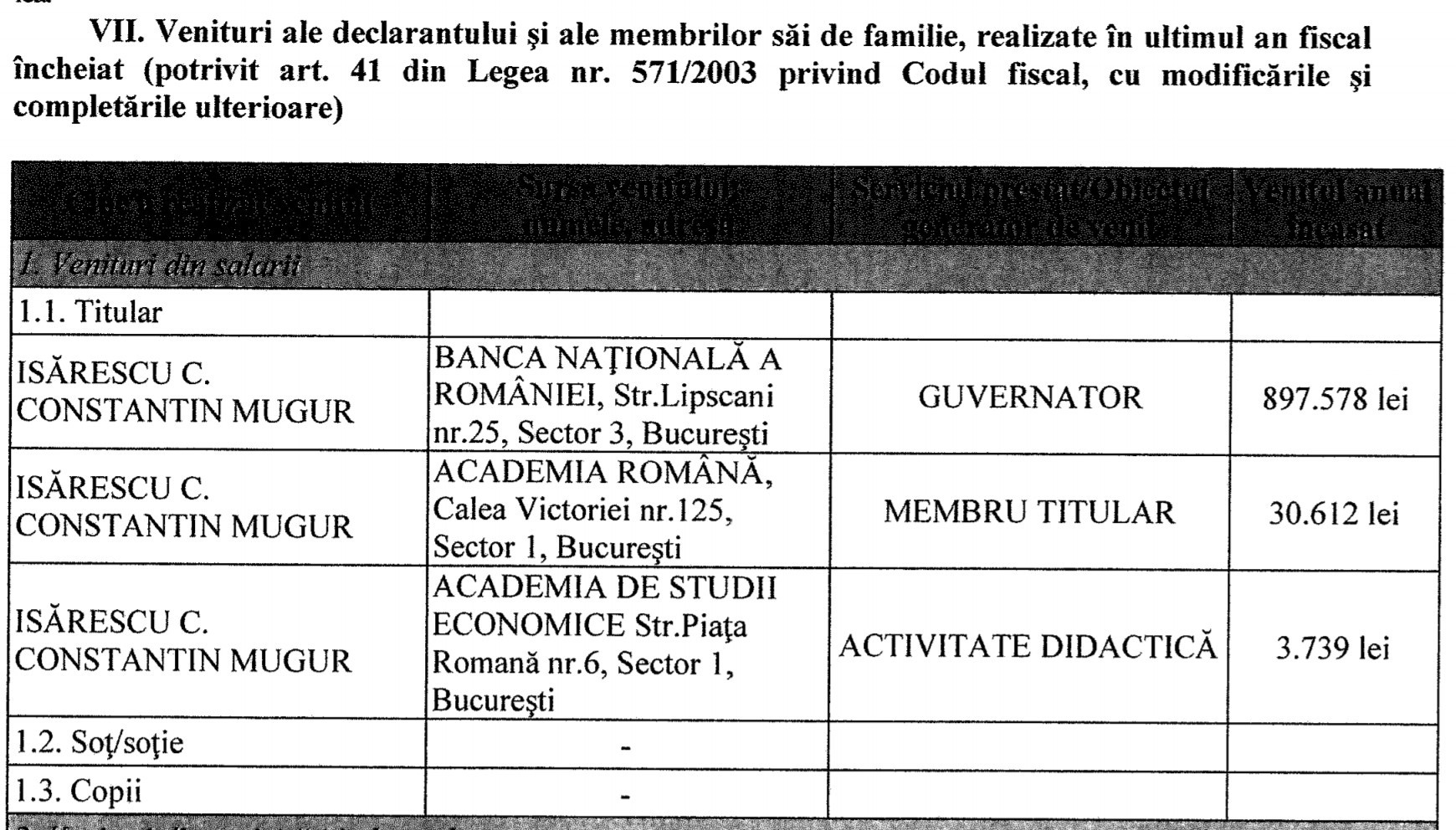 Pentru activitatea didactică prestată în cadrul Academiei de Studii Economice din București, Isărescu a primit 3.739 de lei, de peste 10 ori mai mult decât cu un an înainte, când suma a fost de 351 de lei.