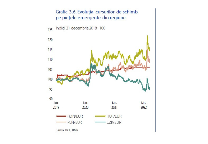 Pe ansamblul primului trimestru din 2022, leul și-a menținut practic neschimbată valoarea în raport cu euro în termeni nominali și s-a apreciat cu 4,0% în termeni reali. Față de dolarul SUA, acesta s-a depreciat cu 2,5% în termeni nominali și s-a apreciat cu 1,4% în termeni reali, în condițiile în care valoarea monedei americane a crescut în raport cu euro, potrivit raportului BNR privind inflația.