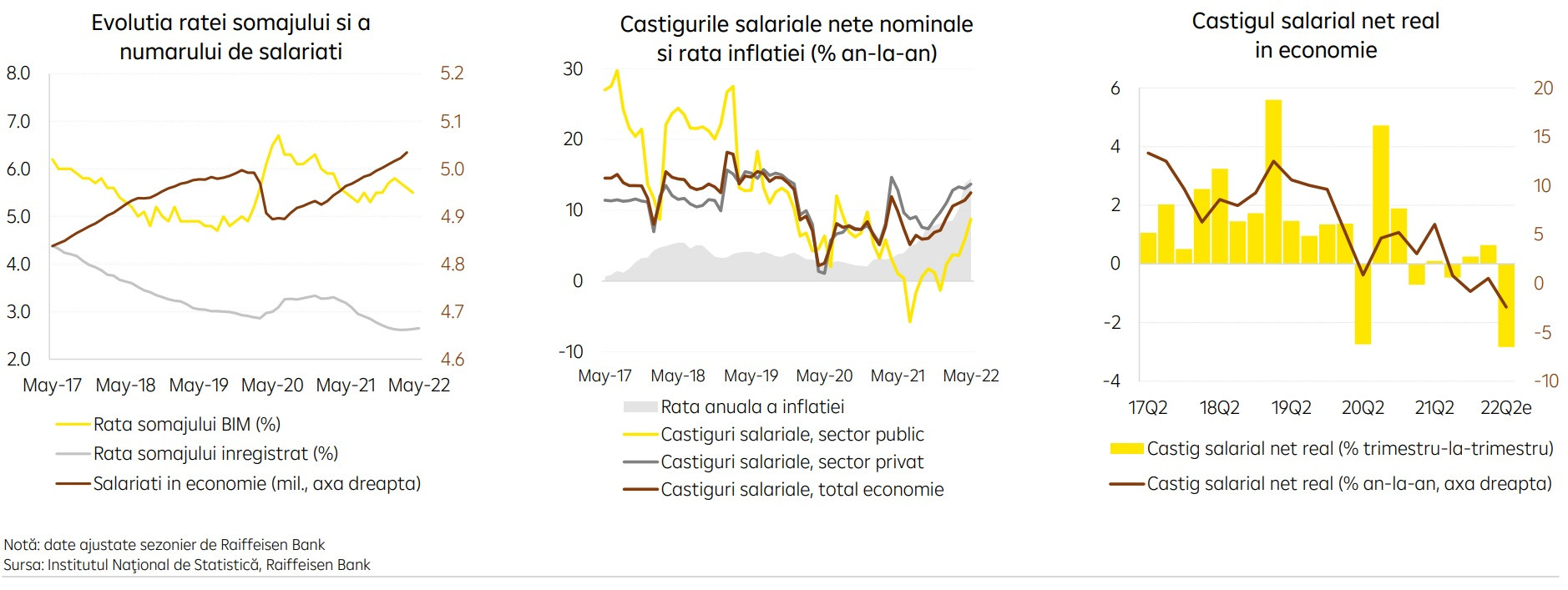 Câştigurile salariale nete s-au majorat rapid în sectorul privat (+13,7% în mai 2022 faţă de mai 2021), dar au înregistrat o creştere moderată în sectorul public (+8,8% în mai 2022 faţă de mai 2021). La nivelul întregii economii, câştigurile salariale scad însă în termeni reali.