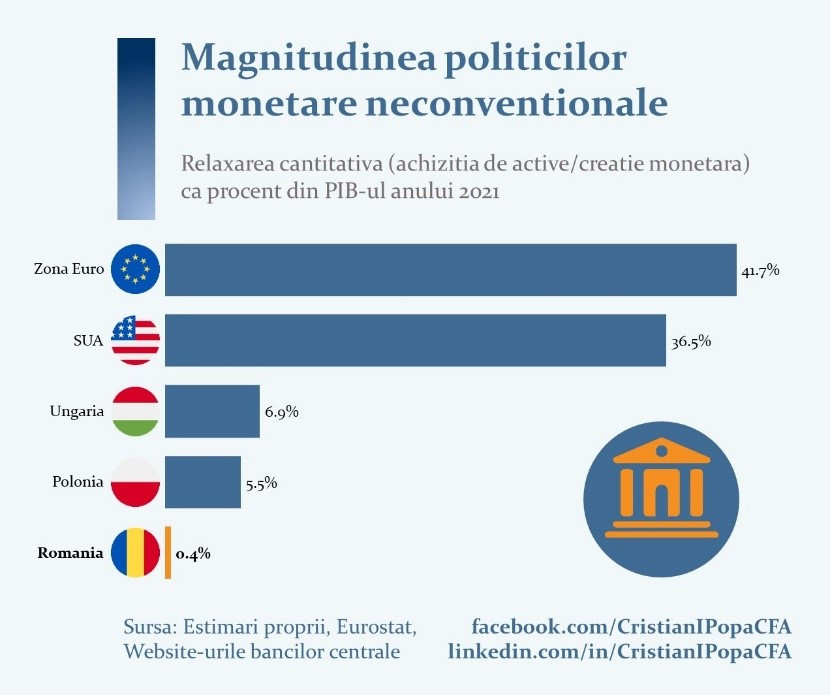 BNR nu a mers nici pe această direcție, denumită relaxare cantitativă, BNR a realizat achiziții de titluri de stat ce echivalează cu doar 0.4% din PIB-ul anului 2021. Spre comparație, Banca Națională a Poloniei a cumpărat echivalentul a 5.5% din PIB, Banca Națională a Ungariei 6.9% din PIB, în timp ce Banca Centrală Europeană a achiziționat active de peste 40% din PIB-ul zonei Euro. Infograficul pe care îl prezint mai jos cred că este grăitor.