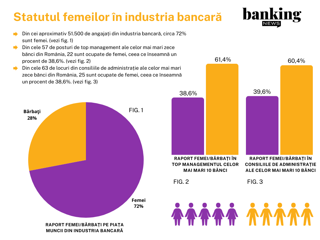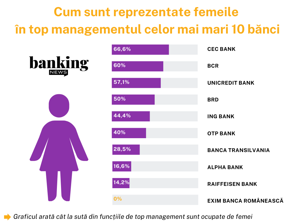 În România doar 5 din cele 32 de insituții financiare au la cârmă o femeie: la BRD pe Maria Rousseva, ING pe Mihaela Bitu, Unicredit Bank pe Mihaela Lupu, Gabriela Nistor la Idea Bank și Cristina Mahika-Voiconi la Libra Internet Bank. Banca din România cu cele mai multe femei în funcții executive este CEC Bank, cu un procent de peste 66% al femeilor aflate în funcții de top management.