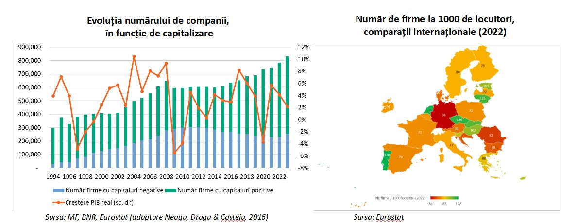 Cum a evoluat numărul de firme în România vs. media europeană. Sursă: BNR