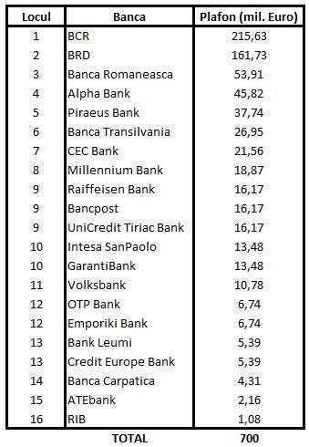 Plafonul aprobat pentru Raiffeisen Bank, Bancpost, UniCredit Tiriac Bank a fost de 16,17 milioane euro pentru fiecare.