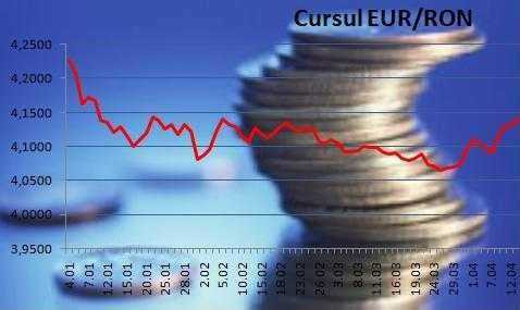 Moneda nationala se apreciase puternic in luna martie, cursul coborand pana la 4,065 lei/euro si chiar si mai jos pe piata interbancara, insa tot avansul obtinut in fata monedei europene a fost pierdut in 12 zile, timp in care cursul de schimb a urcat la 4,1425 lei/euro, nivel apropiat ca pe 21 ianuarie, potrivit referintelor publicate de banca centrala.
