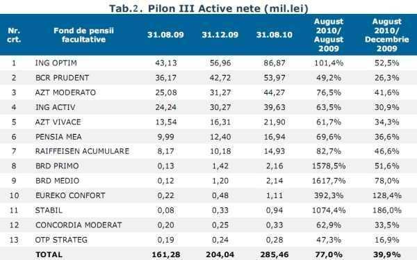 Trendul constant ascendent al cresterii activelor nete in sistem a fost inregistrat si la nivelul fiecarui fond in parte. Fondurile de pensii ING Optim, BCR Prudent si AZT Moderato au continuat sa inregistreze cele mai mari valori ale activelor nete.