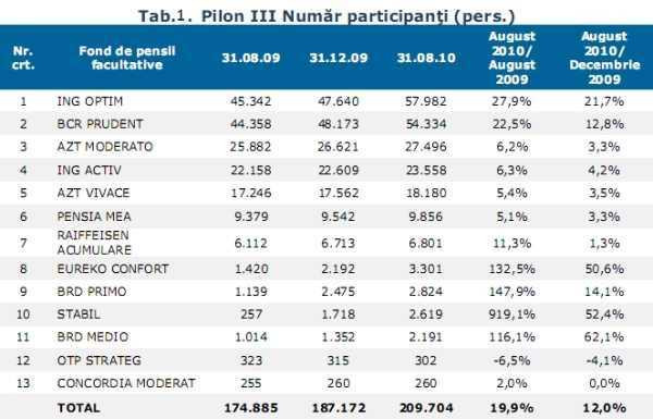 Astfel, pe 31 august 2010, un numar de 209.704 participanti contribuiau la cele 13 fonduri de pensii facultative, administrate de 10 companii, se arata in Buletinul lunar publicat de supraveghetorul pensiilor private - CSSPP.