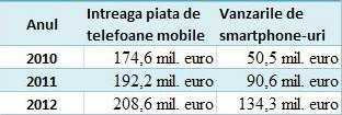 Pe de alta parte, romanii au cumparat anul trecut smartphone-uri in valoare de 134,3 milioane de euro, in crestere cu aproape 50% fata de 2011, conform unor date oferite Wall-Street.ro de catre compania de cercetare Gfk Romania. De asemenea, ca valoare, vanzarile de telefoane mobile erau estimate anul trecut la circa 3-3,5 milioane de unitati, dintre care smatphone-urile reprezentau aproximativ un milion, potrivit jucatorilor din domeniu
