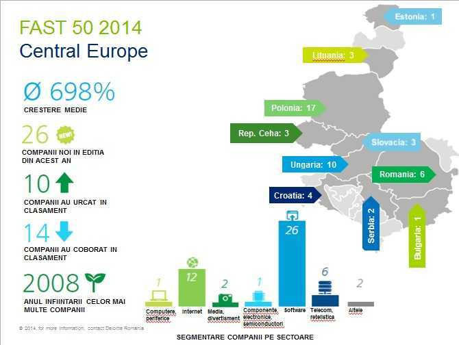 Romania ocupa pozitia a treia in clasamentul Deloitte CE Technology Fast 50 2014, cu sase companii in competitia celor mai dinamice companii din domeniul tehnologic, pe baza cresterii veniturilor obtinute in perioada 2009 – 2013, fiind surclasata doar de Polonia si Ungaria, care detin un numar mai mare de firme in top.