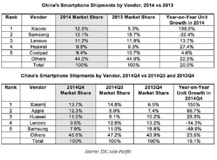 China a devenit cea mai mare piata de smartphone-uri la nivel global, cu peste 420 de milioane de terminale vandute in 2014, conform datelor IDC, unde Xiaomi a reusit sa-si adjudece o cota de piata de 12,5%, in crestere cu peste 180% fata de anul 2013, luand astfel fata rivalilor de la Samsung, care au coborat pe pozitia secunda, cu o cota de piata de 12,1%, in scadere fata de 18,7% cat detineau in urma cu un an.