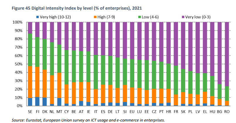 De asemenea, raportul european arată că avem performanțe slabe la digitalizare atât în sectorul public, cât și în cel privat. Astfel, ”ponderea IMM-urilor care au cel puțin un nivel de bază de intensitate digitală (22 %) și procentajul întreprinderilor care fac schimb electronic de informații (17 %) sunt cele mai scăzute din UE.”