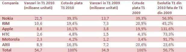 Astfel, vanzarile de iPhone-uri au crescut in T1 cu circa 130% fata de aceeasi perioada a anului trecut, in timp ce telefoanele Blackberry au avut un avans de 45%, cea mai mica evolutie inregistrata de primii cinci jucatori pe piata smartphone-urilor.