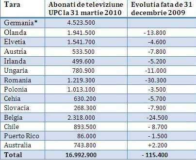 *Datele pentru filiala din Germania nu sunt specificate pentru primul trimestru din 2009 pentru ca Liberty Global are operatiuni pe piata germana din toamna anului trecut de cand a cumparat pentru 3,5 miliarde de euro compania Unitymedia. Insa la finalul lui martie 2009, Unitymedia avea 4,577 milioane de clienti pe televiziune conform Liberty Global.