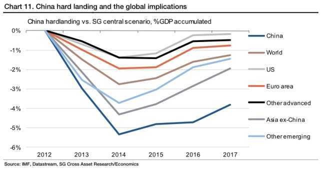 Scenariul imaginat de analistii Societe Generale ia in calcul oarecum situatia actuala, cu decalaje majore de productie in majoritatea economiilor importante ale lumii si un ritm scazut de diminuare a indatorarii statelor, in contextul in care plaja de arsenale strategice este deja epuizata. "Adaugati o aterizare fortata a economiei chineze la acest mix", spun analistii bancii. Incertitudinea ar stimula companiile sa franeze si mai mult planurile de investitii si deciziile de angajare si extindere, chiar si in cazul celor care nu sunt expuse in mod direct pietei interne din China. Feedback-ul resimtit in evolutia pietelor financiare ar amplifica socul incertitudinii, ceea ce ar sparge pretul activelor riscante. La nivel global, Societe Generale estimeaza ca socul de incertitudine, combinat cu aterizarea dura a Chinei ar putea depasi 1%, in scadere, din PIB-ul global (vezi grafic).