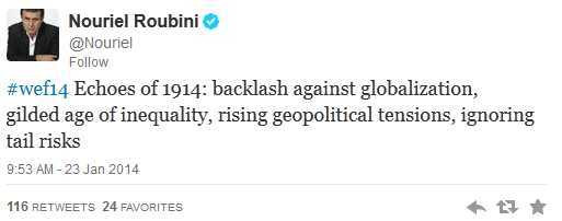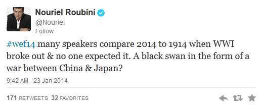 "Multi speakeri compara anii 2014 si 1914, cand a inceput Primul Razboi Mondial si nimeni nu se astepta la asta. O lebada neagra in forma unui razboi intre China si Japonia?", a scris profesorul supranumit "Doctor Doom".