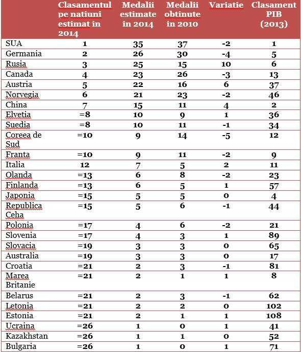 Estimarile pentru editia Jocurilor Olimpice din 2014 au fost facute si in functie de medaliile obtinute de tarile candidate la olimpiada din 2010 organizata in Vancouver, Canada.