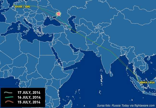 Ceea ce este ciudat la MH17 este ca traseul de zbor de joi a fost diferit comparativ cu cel obisnuit pe deasupra Ucrainei. Conform datelor oferite de flightaware.com, un website de evidenta a traficului aerian civil, zborul de joi a fost deviat cu aproximativ 200 kilometri spre nord, fata de zilele precedente ceea ce a pozitionat avionul Boeing 777 chiar deasupra zonei de conflict.