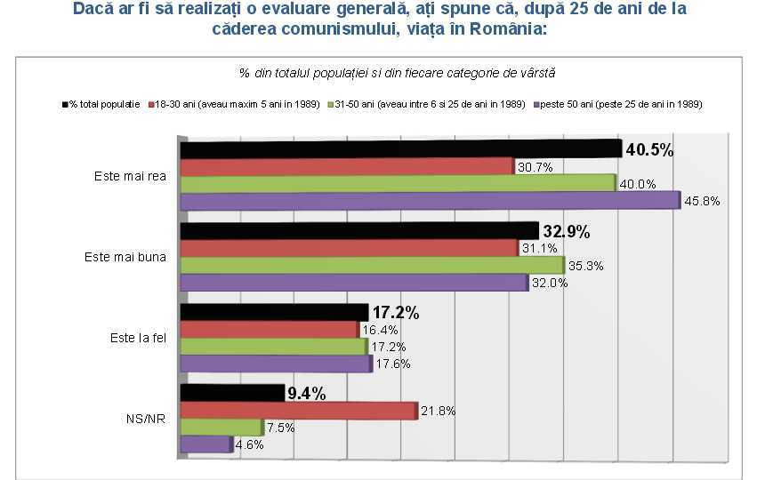 Impresia ca viata este acum mai rea decat in Epoca de Aur creste o data cu varsta. 30,7% din cei pana in 30 de ani, 40% din cei intre 31 si 50 de ani si 45,8% din cei peste 50 de ani cred ca situatia s-a degradat dupa 1989.