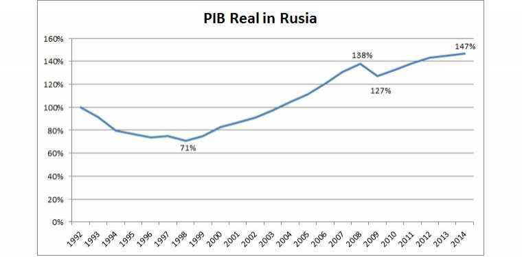 Aceasta a fost, de asemenea, o perioada in care economia Rusiei s-a prabusit puternic. Conform FMI, economia Rusiei s-a contractat cu aproape 30 la suta in timpul mandatului presedintelui Boris Eltin. Odata cu venirea lui Vladimir Putin la putere in 1999 si pana in prezent, economia reala a Rusiei si-a dublat dimensiunea. Aceasta performanta economica probabil ca explica o mare parte din sprijinul aratat lui Vladimir Putin in sondaje de catre opinia publica.