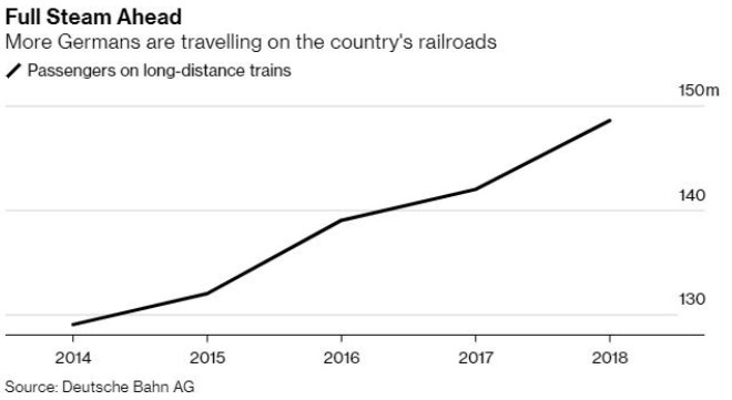 Pe langa reducerea numarului de calatorii aeriene interne, compania feroviara nationala, Deutsche Bahn, a raportat un numar record de pasageri pe distante lungi, cu peste 150 de milioane de utilizatori in 2019. Compania isi propune, de asemenea, sa-si reduca emisiile de CO2 la jumatate pana in 2030 si sa-si alimenteze trenurile utilizand exclusiv energie electrica regenerabila pana in 2038.