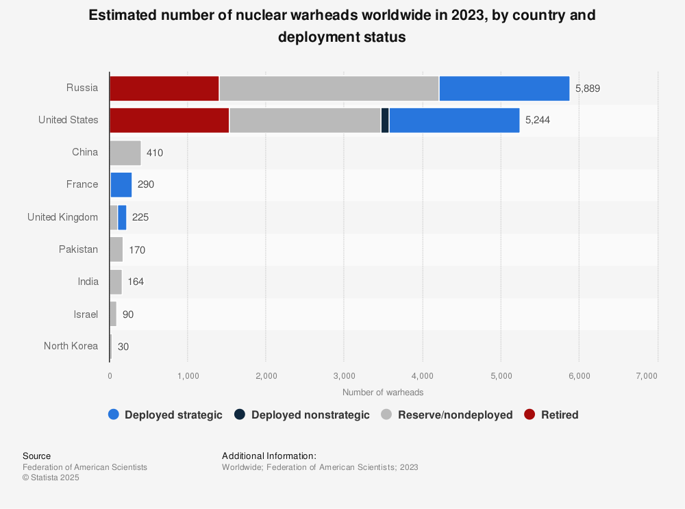 Aproximativ 90% dintre focoasele nucleare din lume sunt deţinute de Rusia şi SUA, ce rămân de departe cele mai mari puteri nucleare.