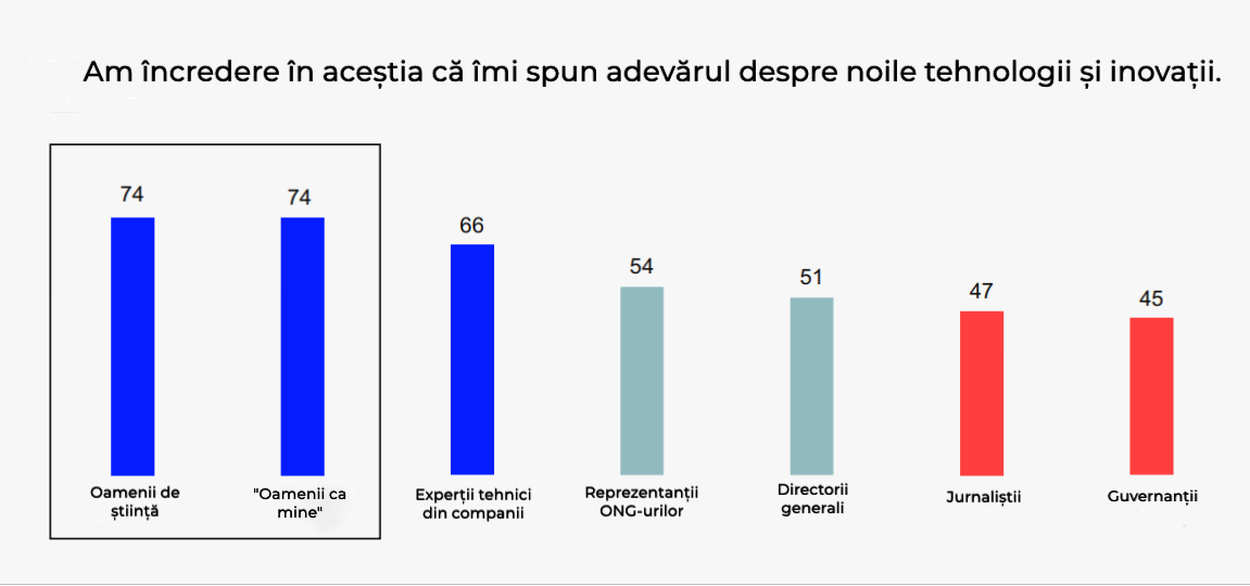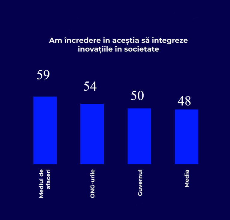 Mediul de afaceri are cele mai mari șanse de a întoarce acest trend, deoarece este instituția în care se are cea mai mare încredere atât în general, cât și atunci când vine vorba de introducerea de noi inovații în societate. Dar trebuie să se concentreze pe explicarea impactului inovării și a efectelor net pozitive ale acesteia pentru societate, nu doar pentru investitori. Totuși, acesta nu poate acționa singur. În ultimul deceniu, Barometrul de Încredere a înregistrat o creștere de 15 puncte (de la 45% la 60%) a numărului de persoane care consideră că un parteneriat între întreprinderi și guvern în vederea dezvoltării și implementării de inovații bazate pe tehnologie le-ar spori încrederea în întreprinderi. Aproape două treimi dintre angajați se așteaptă ca directorii executivi să gestioneze schimbările care au loc în societate, nu doar pe cele care au loc în afacerea lor (62%), iar aproximativ 8 din 10 angajați spun că este important ca directorul lor executiv să vorbească public despre competențele profesionale ale viitorului (82%), despre utilizarea etică a tehnologiei (79%) și despre impactul automatizării asupra locurilor de muncă (78%).
