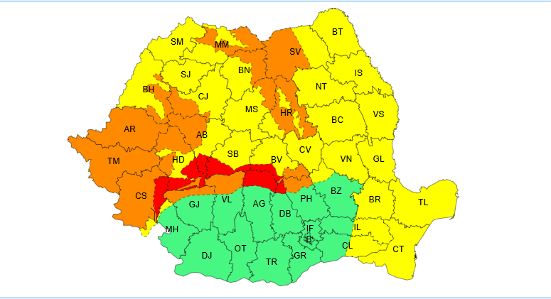 Administraţia Naţională de Meteorologie (ANM) a emis o serie de noi avertizări Cod roşu, Cod portocaliu şi Cod galben de vreme severă, valabile în peste jumătate din ţară, până sâmbătă seara.