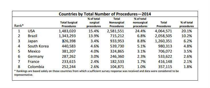 SUA si Brazilia ocupa pozitiile fruntase ale clasamanentului inca din 2010, urmate de Japonia, Koreea de Sud, Mexic, Germania, Franta si Columbia. De altfel, in ultimii patru ani pozitiile fruntase au fost ocupate tot de aceste tari, cu mici varianti, in clasament fiind integrate, la un moment dat, si China, Italia, India si Spania. In SUA, in 2014, au fost efectuate peste 4 milioane de proceduri, atat chirurgicale, cat si nechirurgicale, si care reprezinta 20% din totalul procedurilor realizate la nivel global.