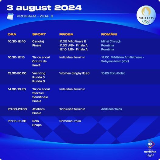 Sportivii români vor evolua la Jocurile Olimpice de la Paris, pe 3 august 2024, la canotaj, tir cu arcul, yachting, atletism și polo. Orele prezentate mai jos sunt cele stabilite pentru ora României.