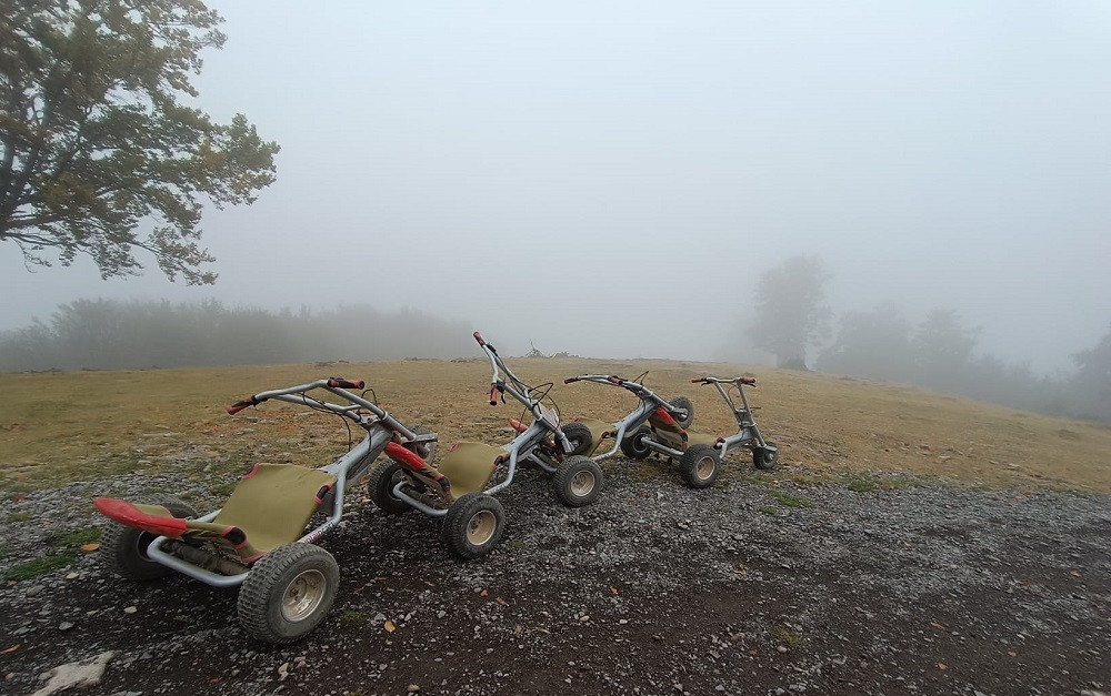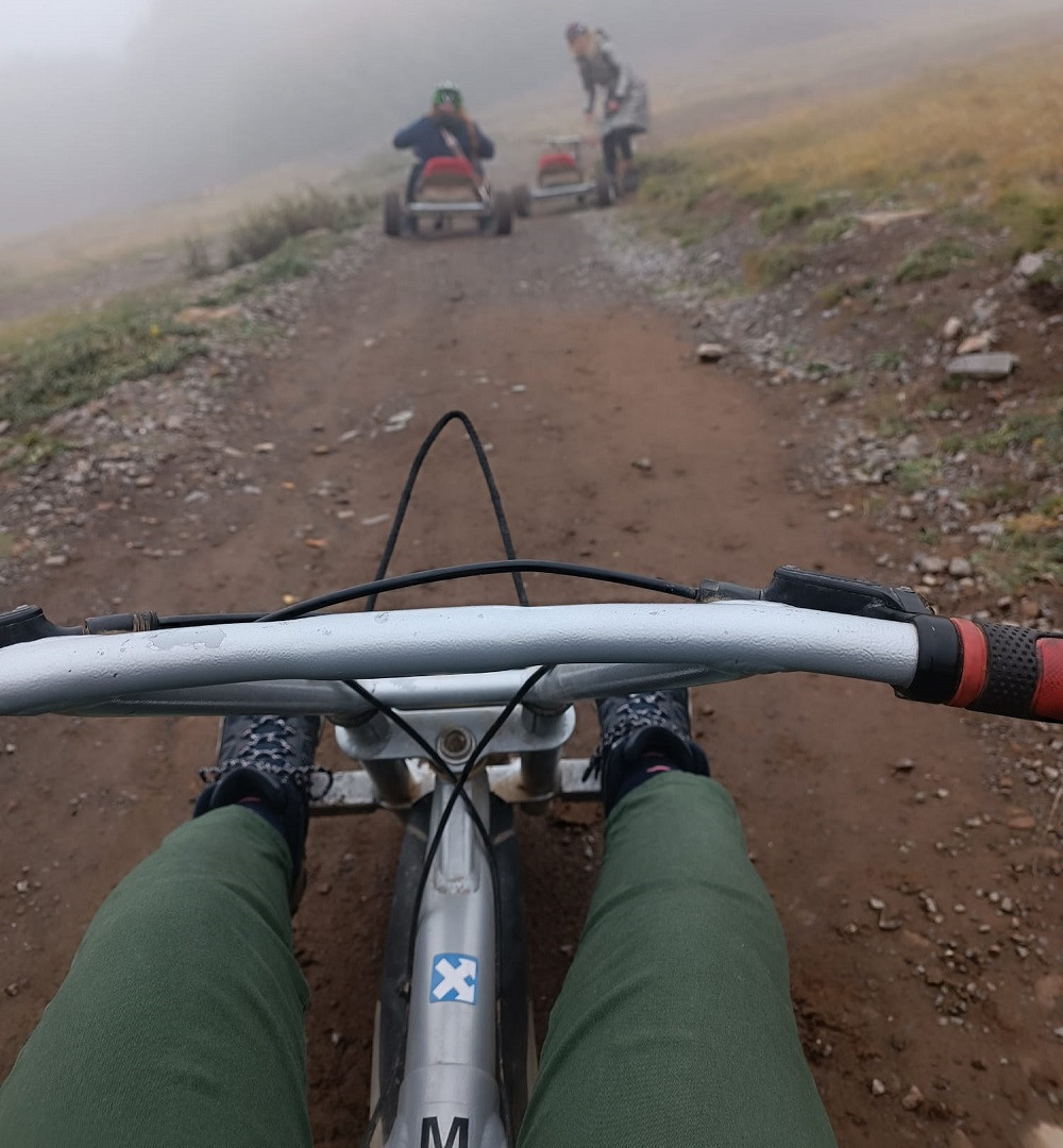 O altă atracție turistică ce se află tot în același loc este și care face senzație printre iubitorii de adrenalină sunt și mountain cart-urile. Acestea sunt un soi de triciclete cu care poți coborî pe un drum cu denivelări și pe care poți să te dai indiferent de anotimp. Acest echipament de tip cart nu este dotat cu accelerație, ci doar cu frână. Ca recomandări aici, pe lângă atenția la drum (care este unul plin de denivelări), trebuie să ai grijă și la pietricele mici care îți pot sări în față, atunci când ai viteza maximă. Vă las mai jos câteva fotografii pentru a vă face o idee despre cum arată.