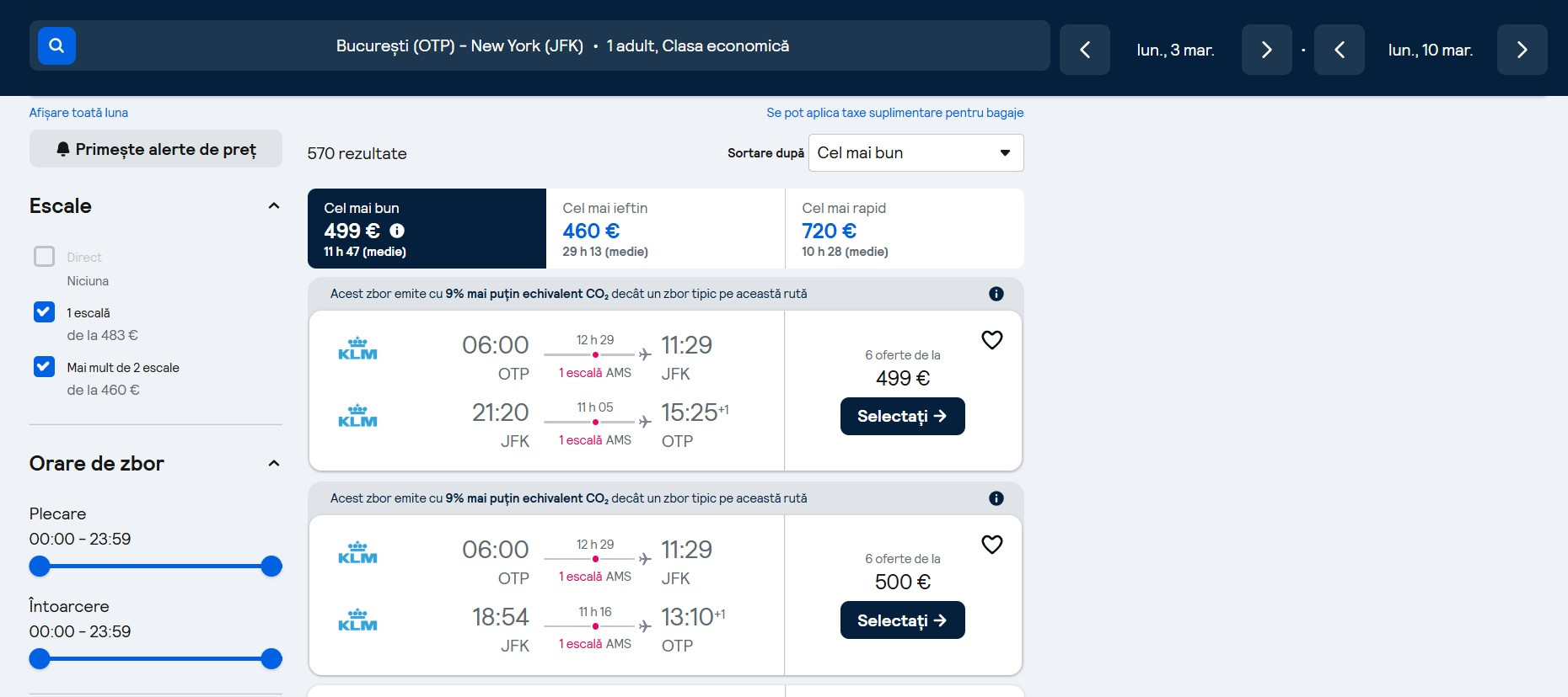 Pe SkyScanner, cea mai bună variantă era cea de 499 de euro, prin operatorul aerian olandez KLM, care oferă zboruri cu escală la Amsterdam, iar durata de zbor medie de aproape 12 ore total în călătoriile dintre aeroporturile Henry Coandă din Otopeni și JFK din metropola americană.