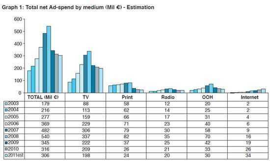 Piata de media va scadea cu 3% in 2011, pana la 306 milioane de euro, sub nivelul din 2006. Internetul va fi singurul mediu care va inregistra crestere anul acesta, depasind pentru prima oara printul si outdoor-ul, potrivit ultimului raport Media Fact Book.