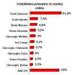 Ierarhia vizibilitatii este condusa de Sorin Oprescu, care inregistreaza peste 31% dintre mentiunile din online despre cei 41 de primari (2905 de mentiuni din totalul de 9286).