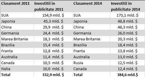 Investitiile din cele mai mari zece piete vor totaliza anul acesta in jur de 333 de miliarde de dolari, in timp ce intreaga piata de publicitate este estimata la circa 464 miliarde de dolari, in crestere cu circa 3,5% fata de 2010.