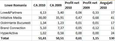 Anul trecut Lowe&Partners a inregistrat o scadere a cifrei de afaceri cu aproximativ 5% fata de cea din 2010,cand businessul companiei a fost in jurul a 6,13 milioane de euro. Pe de alta parte, profitul net a fost asemanator cu cel din urma cu doi ani, in 2010 agentia raportand un castig de circa 65.000 de euro. Compania are in prezent 26 de angajati. Aura Toma spune ca printre primele masuri pe care le-a luat a fost intarirea echipei pe partea de BTL, creatie, client service, managerul adaugand ca se vor mai face recrutari si in perioada urmatoare. De altfel, agentia si-a extins de la inceputul anului divizia de BTL (Lowe Vibe), care din noiembrie 2011 este condusa Mircea Sebe, un manager cu peste 12 de experienta in domeniu.