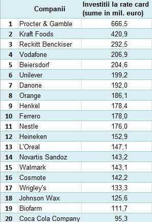 Astfel, Procter&Gamble Romania, filiala celui mai mare producator de bunuri de larg consum din lume, a alocat anul trecut 666,5 milioane de euro pentru promovare, compania aflandu-se la mare distanta de urmatorii clasati, Kraft Foods si Reckitt Benckiser. In 2010, bugetul P&G a fost de circa 659 de milioane de euro, conform Media Fact Book, studiu realizat de agentia de media Initiative.
