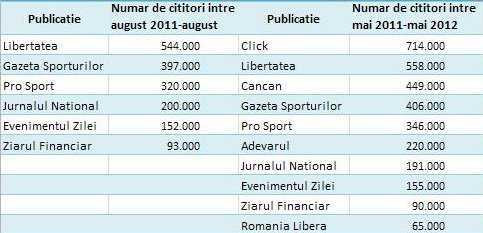 De asemenea, din datele SNA pentru perioada iulie 2011- august 2012 mai lipesesc cotidiene precum Adevarul, Romania Libera sau Cancan. Tabloidul Cancan apare de la inceputul lui august doar online.