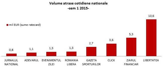Bugetele au fost orientate mai ales catre cotidienele nationale, acestea atragand 44% din bani. Dintre acestea, Libertatea continua sa fie publicatia care a atras cele mai mari volume de publicitate in primul semestru al acestui an, cumuland peste 40% din totalul investiilor atrase de cotidienele nationale.