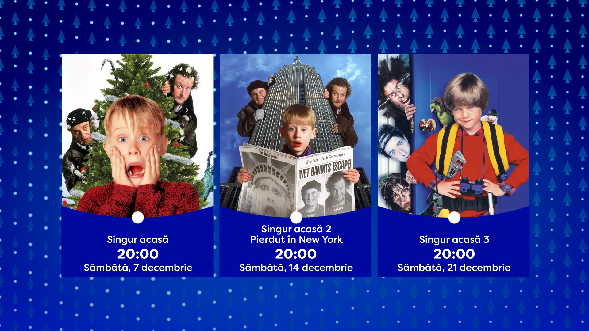 Postul de televiziune a anuntat acum cand se vor difuza cele trei filme "Singur Acasa". Primul film al seriei se vede sambata, 7 decembrie, de la ora 20:00. Joe Pesci isi va incepe asaltul asupra casei lui Kevin, pe care acesta si-o va apara cu determinare, curaj si un praf de magie.