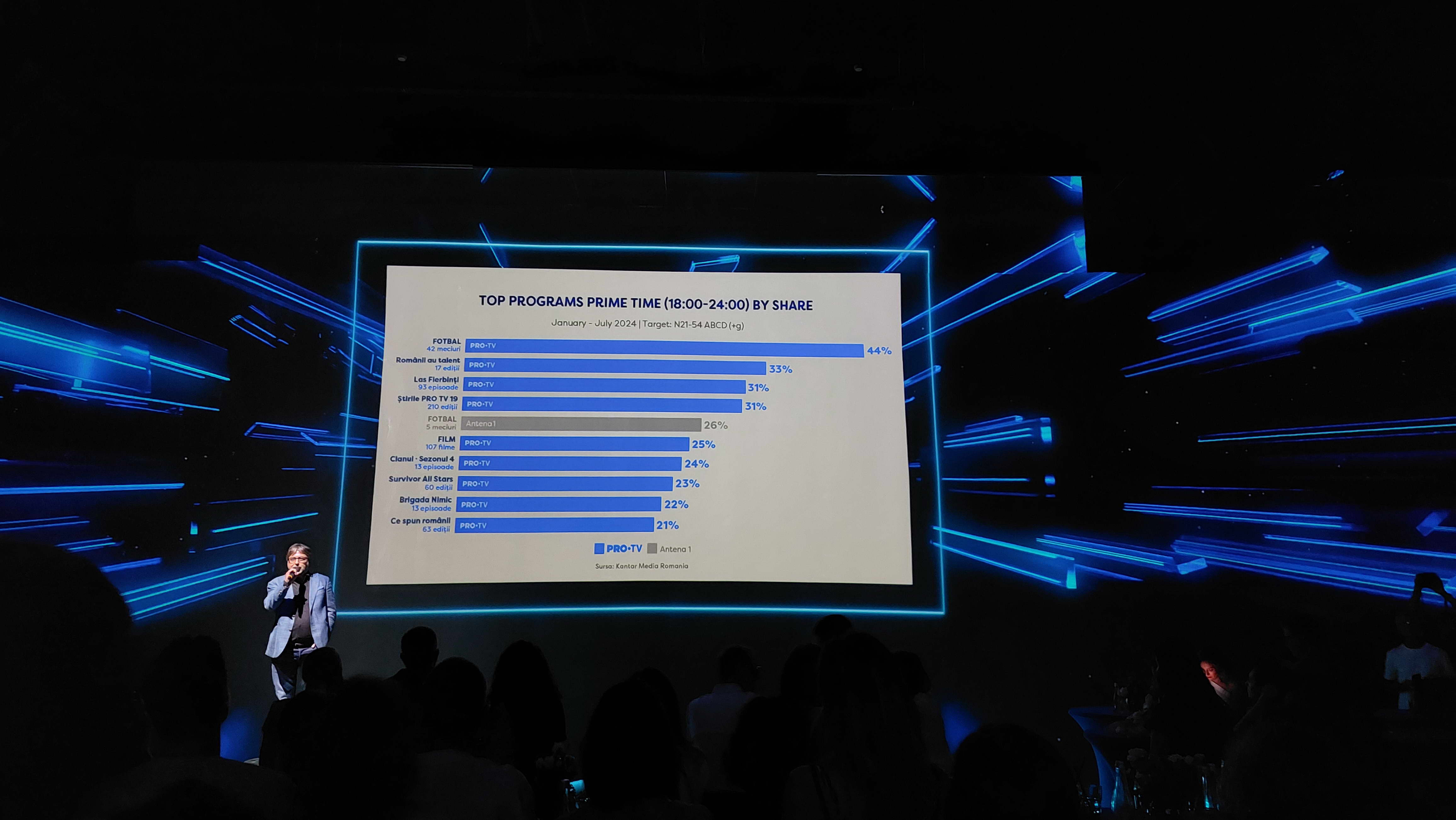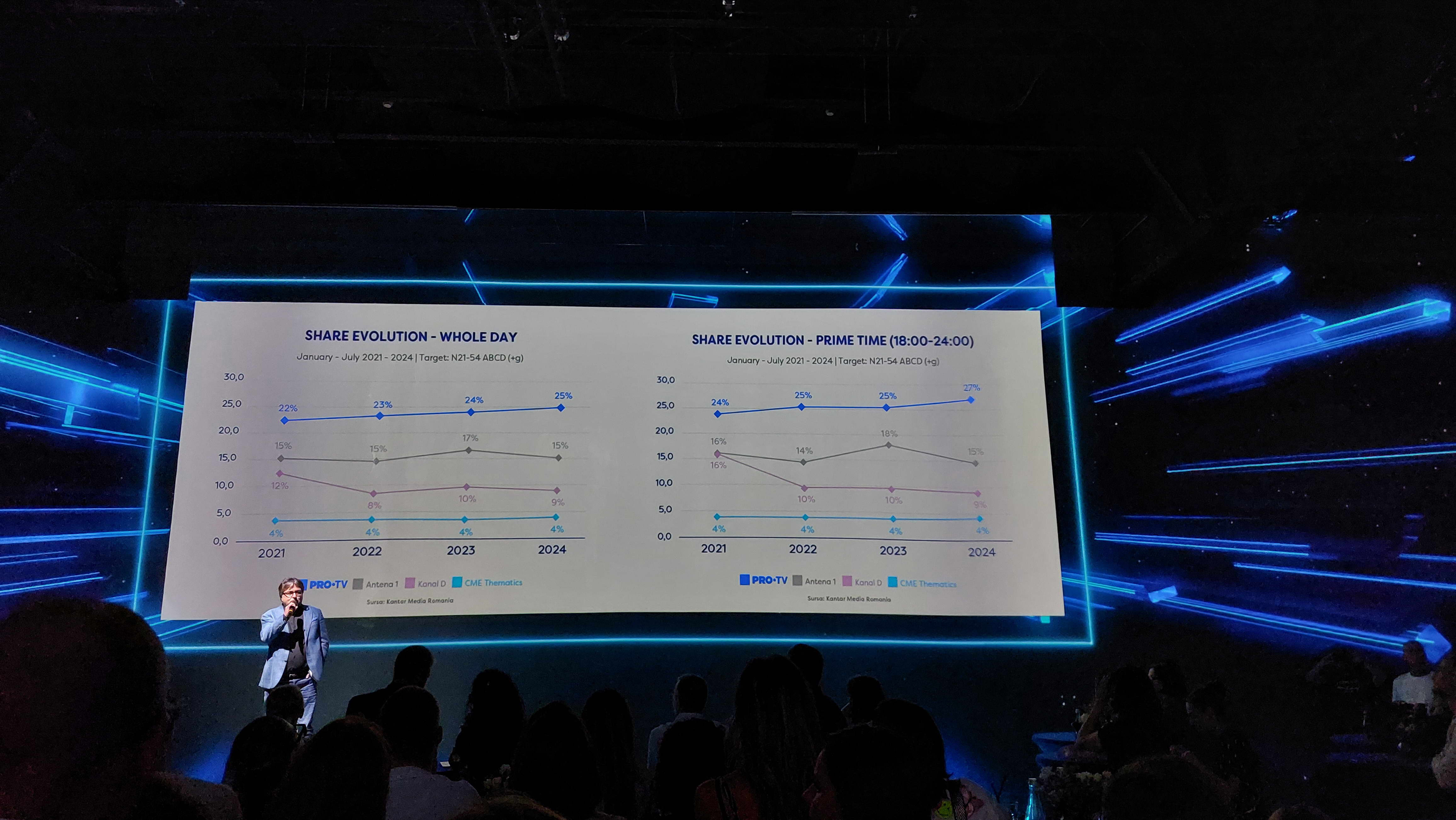 PRO TV a înregistrat în primele șapte luni din acest an (ianuarie – iulie) o cotă de piață de 27% în prime time (orele 18:00 – 24:00), pe audiența țintă cu vârste cuprinse între 21 și 54 de ani, potrivit datelor prezentate de Alexandrescu, parte a unui studiu realizat de Kantar Media România. În perioada similară din 2023, cota era de 25%, aceeași cotă fiind înregistrată și în 2022.