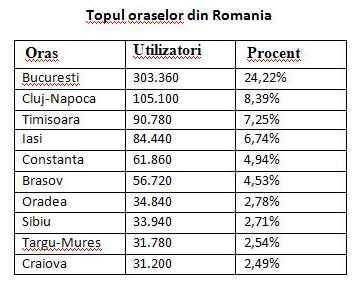 Orasele cu cei mai multi utilizatori de Facebook, cea mai mare retea sociala din lume, in afara de Bucuresti, sunt Cluj-Napoca (8,39%), Timisoara (7,25%), Iasi (6,74%), Constanta (4,94%) si Brasov (4,53%). Cifrele de utilizatori pe judete si orase, precum si paginile locale, pot fi accesate pe Facebrands.ro folosind harta interactiva.