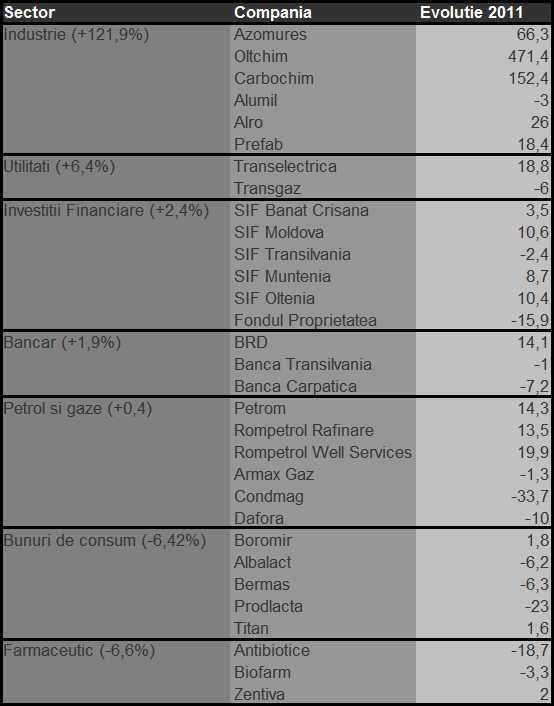 Cresterile spectaculoase inregistrate in 2011 de catre Oltchim (OLT) au impins media randamentelor inregistrate de companiile industriale pana la 121,9%. Actiunile combinatului chimic s-au apreciat cu 471,4% in acest an, pe fondul speculatiilor privind o posibila privatizare, dar mai ales dupa ce grupul german PCC SE a intrat la cumparare incepand cu a doua jumatate a lunii mai.