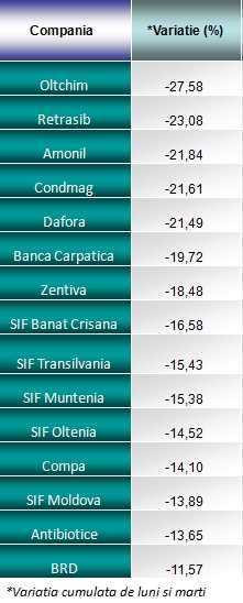 Minimele absolute din acest an au fost atinse in cursul sedintei de marti, atunci cand o parte din indicii BVB au scazut cu peste 15%, in vreme ce unele actiuni au inregistrat corectii mai mari de 20%.