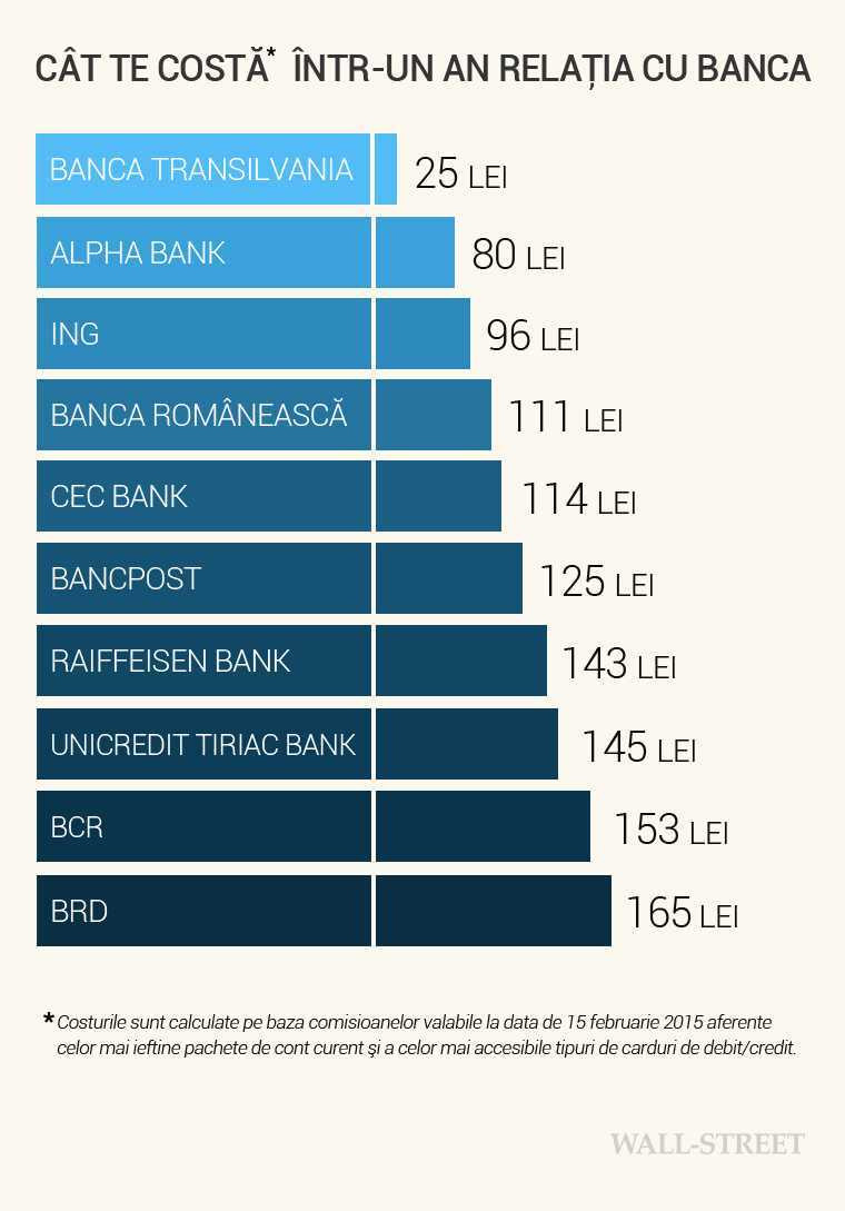 Relatia cu banca poate fi una nabadaioasa, dovada si numeroasele procese cauzate de anumite clauze abuzive. Totusi, in activitatea de zi cu zi cu o banca lucrurile ar trebui sa fie mai usoare si mai transparente. Trebuie doar sa citim cu mare atentie grila de comisioane bancare. WALL-STREET.RO a realizat un infografic despre cat te costa intr-un an relatia cu marile banci, luand in calcul faptul ca un client mediu are doua carduri (unu de credit si unul de debit, ambele in lei) si cate un cont curent, in lei si euro. Unde gasim cele mai mici comisioane bancare?