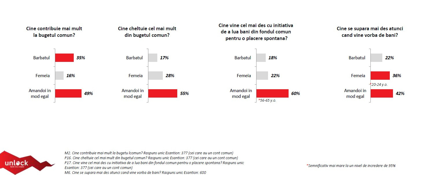 - Chiar dacă 78% dintre cupluri iau decizii financiare împreună, 35% dintre bărbați simt că au un aport financiar mai mare;